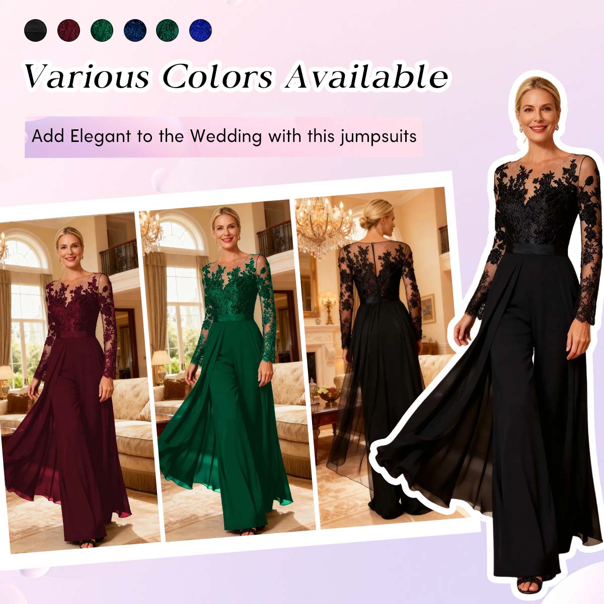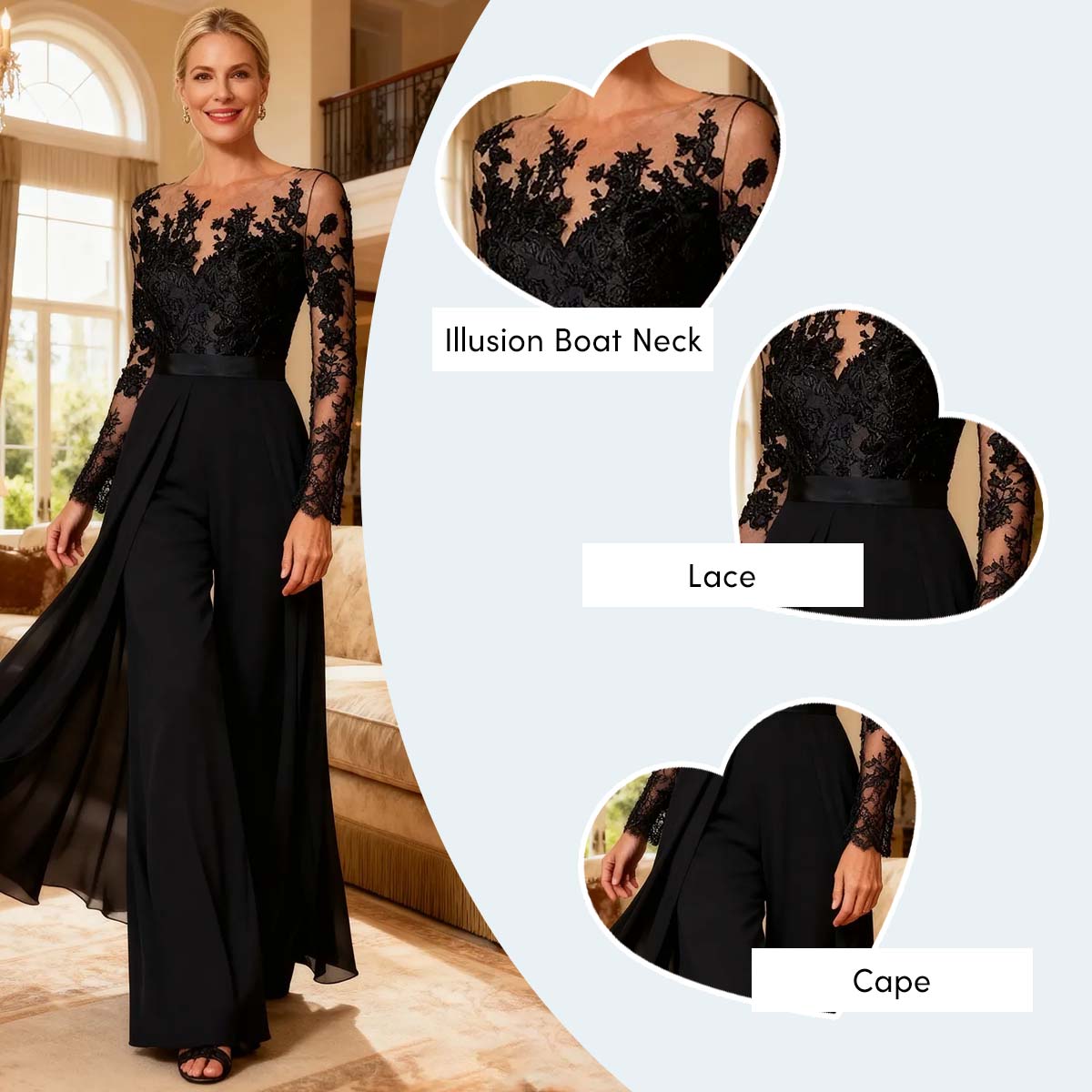 This Chiffon illusion neck jumpsuit blends elegant long lace sleeves, a tailored jumpsuit silhouette, and a dramatic cape for a look that is contemporary, refined, and powerfully chic. Perfect for mothers seeking modern sophistication with a touch of romantic drama at formal wedding celebrations.