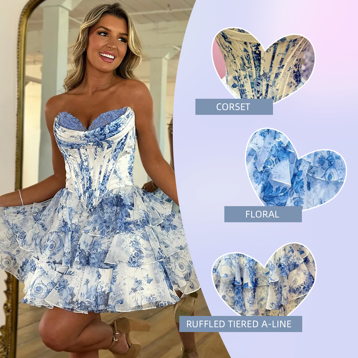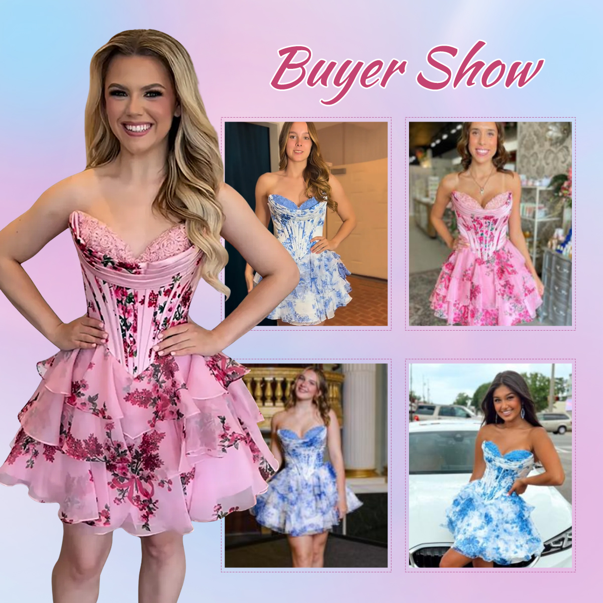 This floral homecoming dress blends a strapless corset bodice, tiered ruffled skirt, delicate ruched details, and sparkling sequin accents for a look that is sweetly romantic, playfully chic, and full of youthful charm. Perfect for celebrating special moments with a touch of garden-party elegance and festive sparkle.