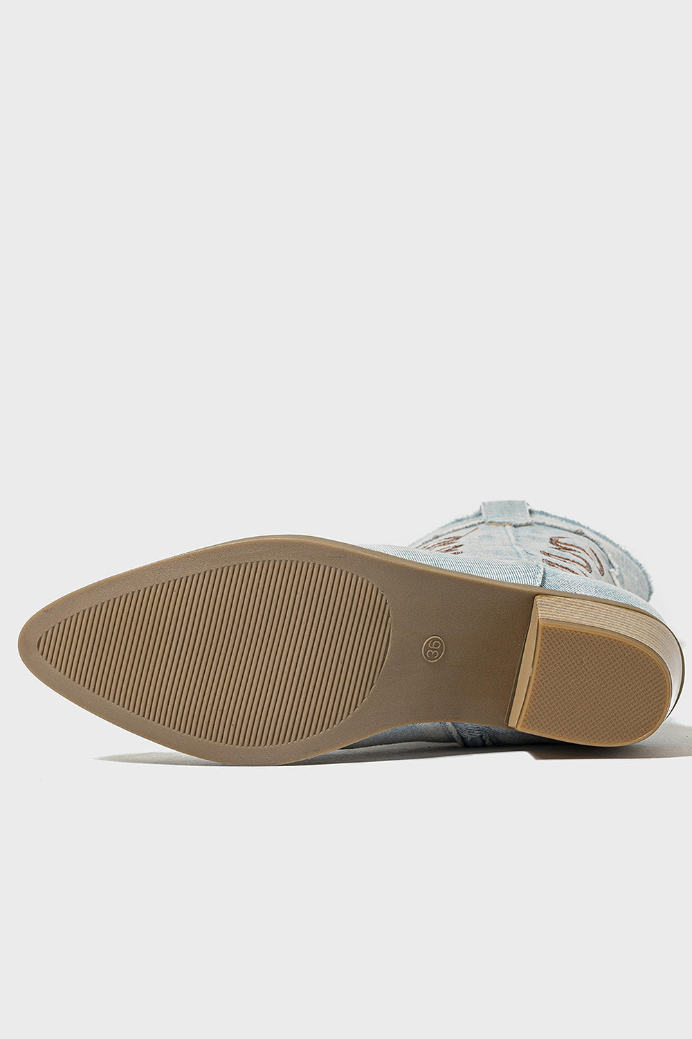 Dark Blue Embroidered Mid Calf Chunky Heel Cowgirl Boots