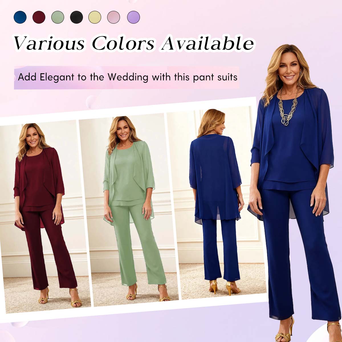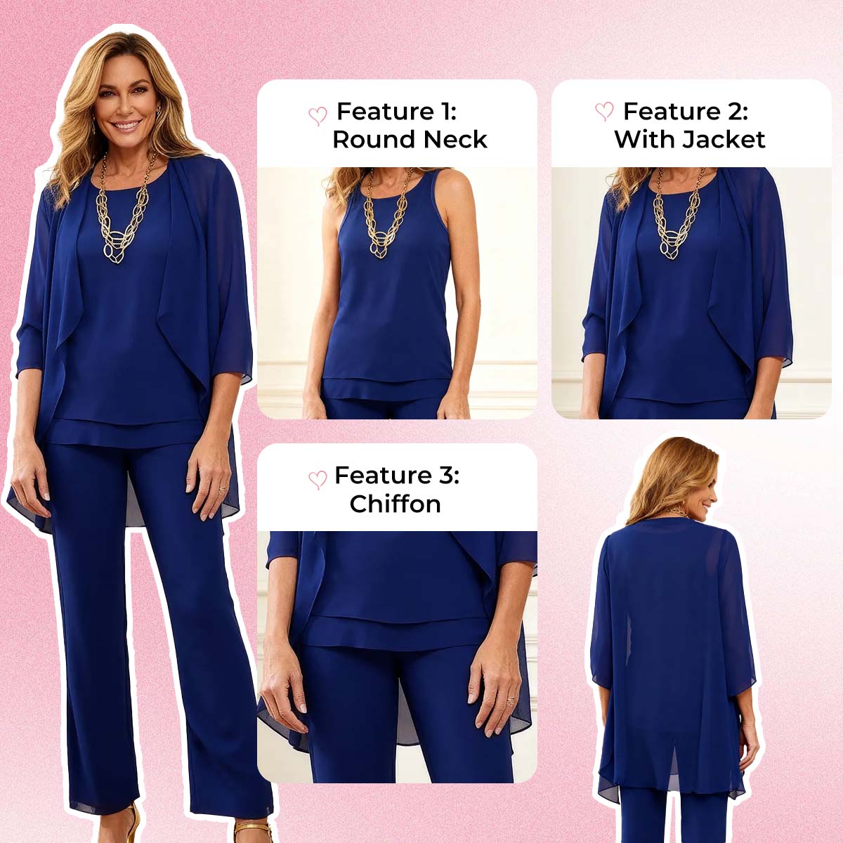 This chiffon pantsuit combines a classic round neck, 3/4 sleeves, and a tailored jacket with matching trousers for a look that is polished, comfortable, and gracefully refined. Perfect for mothers seeking understated elegance, modern versatility, and effortless sophistication at semi-formal to formal wedding events.