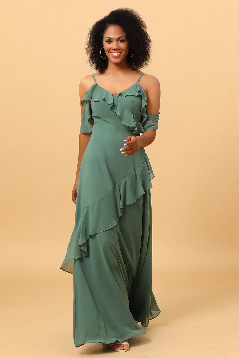 Eucalyptus Spaghetti Straps Long Bridesmaid Dress with Ruffles