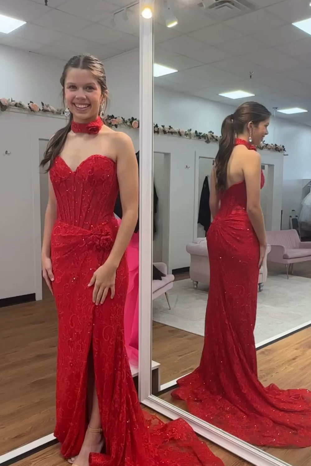 Floral Red Corset Lace Mermaid Long Prom Dress with Slit