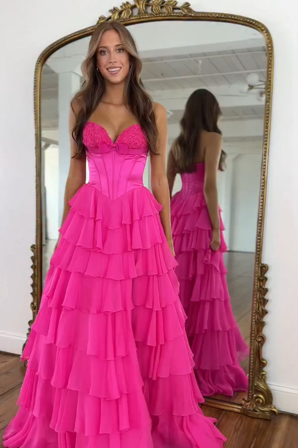 Fuchsia A Line Tiered Strapless Long Corset Prom Dress with Slit
