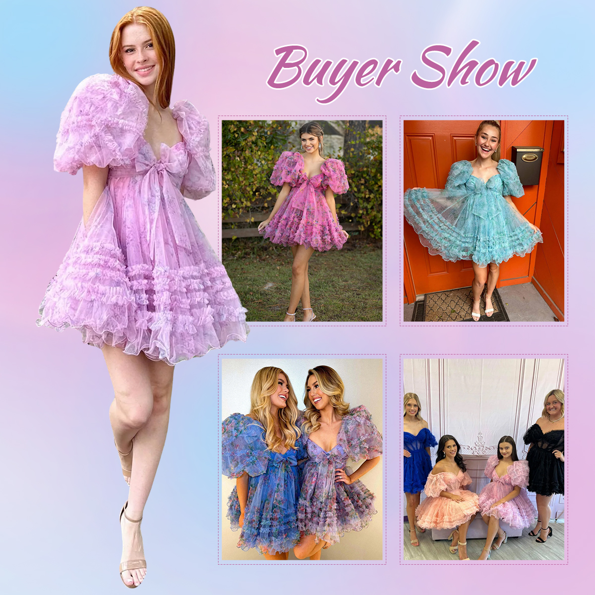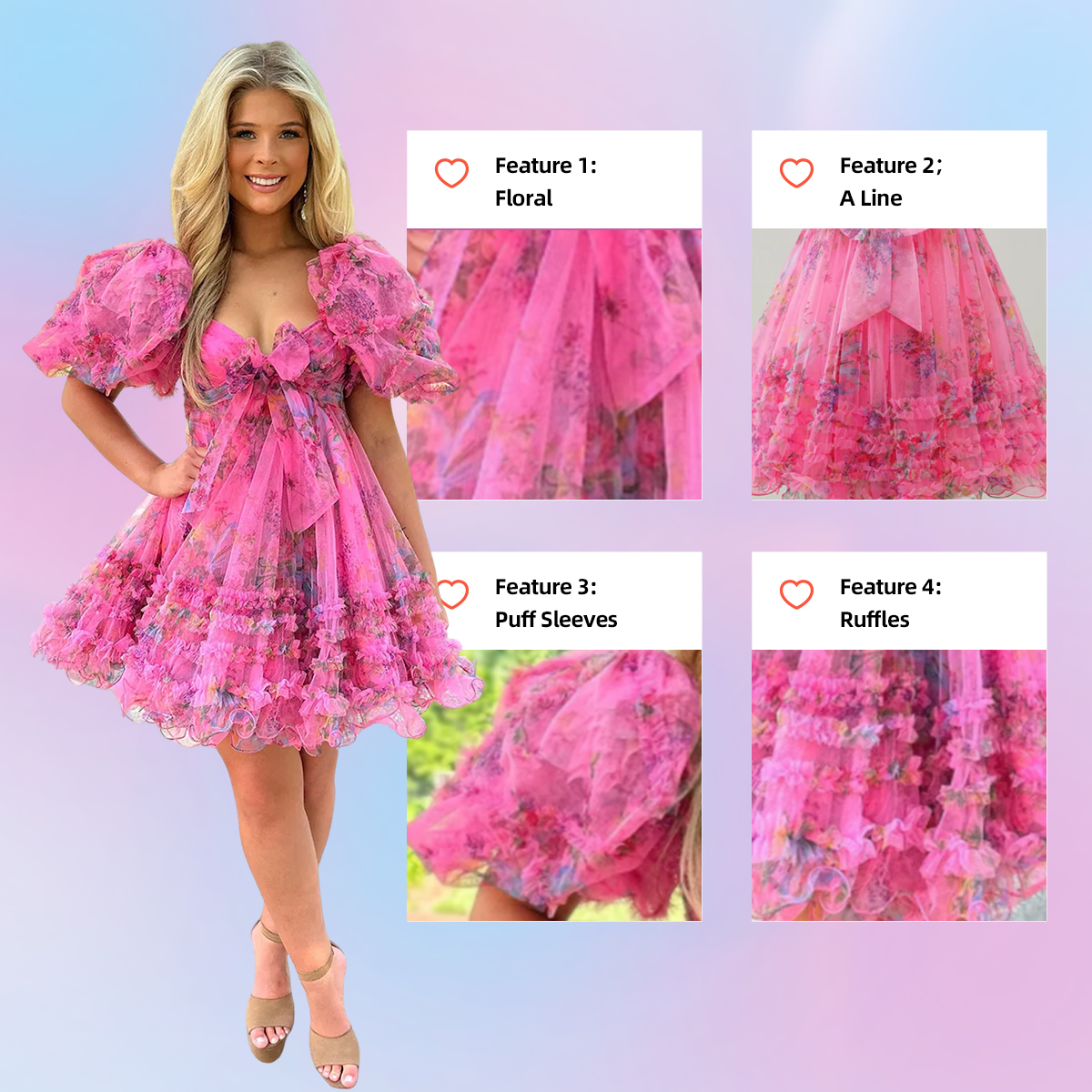 This floral tulle homecoming dress blends a whimsical puff sleeves, a ruffled A-line skirt, and a delicate bow for a look that is sweetly romantic and playfully elegant. Perfect for celebrations where feminine charm, fresh patterns, and youthful grace take center stage.