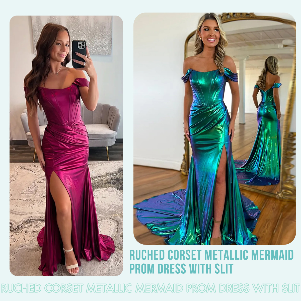 Hot Pink Ruched Corset Metallic Satin Mermaid Prom Dress with Slit