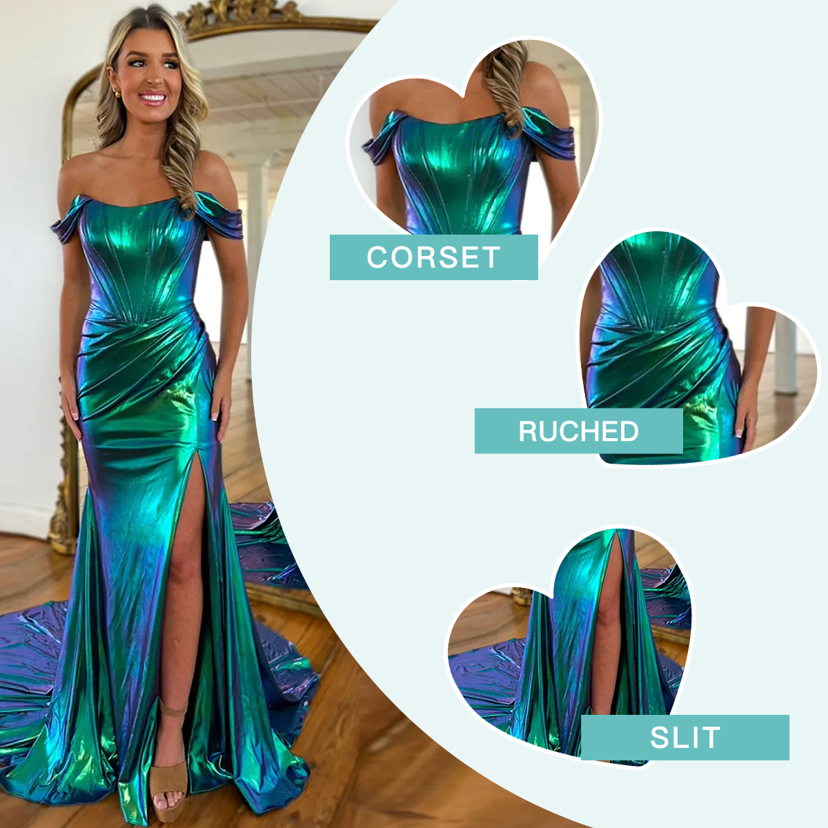 Hot Pink Ruched Corset Metallic Mermaid Prom Dress with Slit