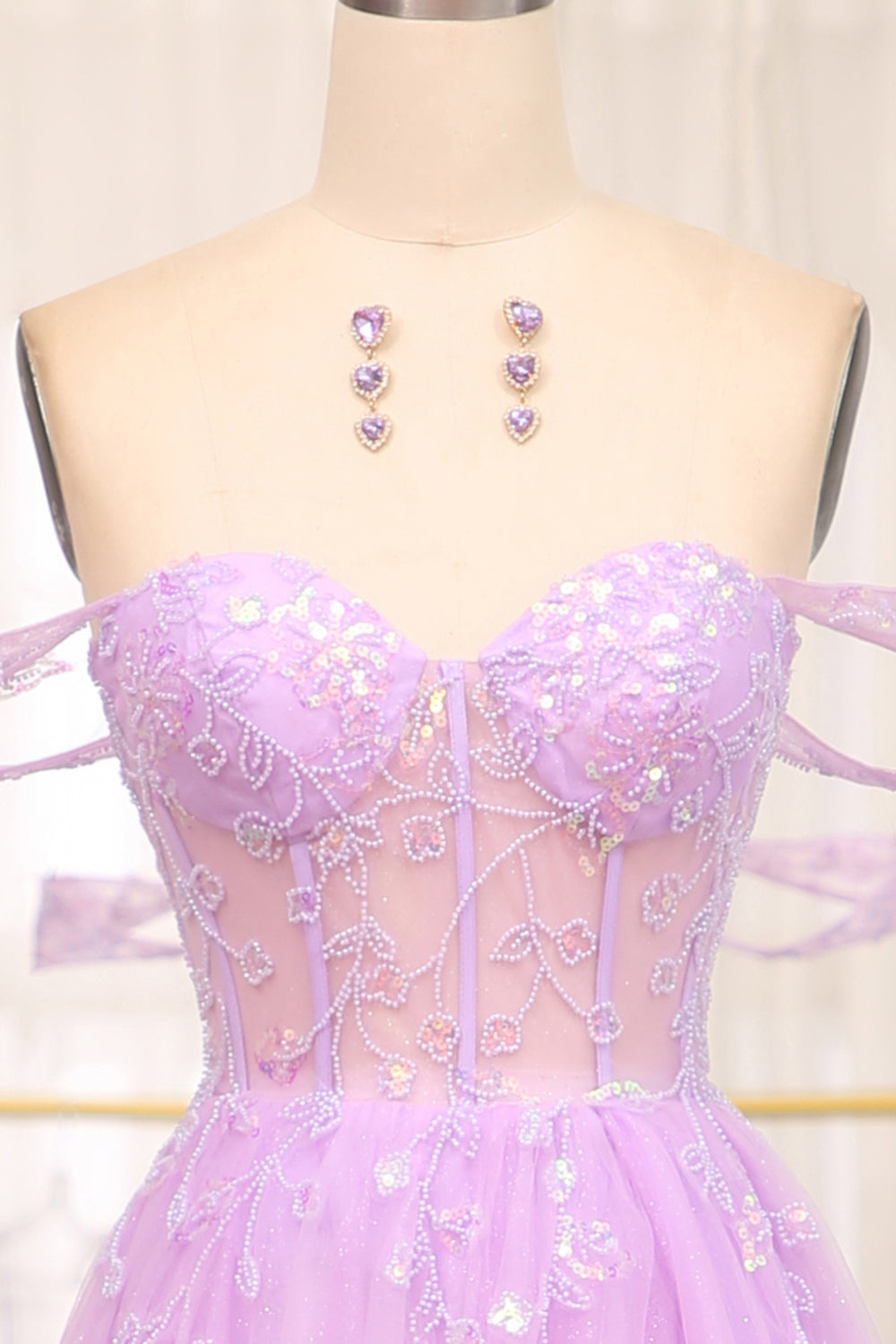 Light Purple A Line Off the Shoulder Long Corset Prom Dress With Slit