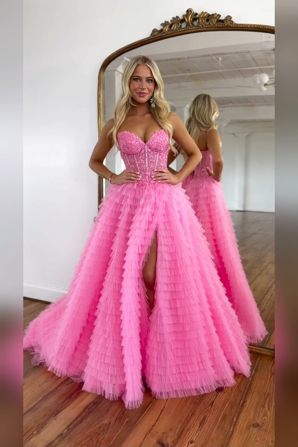 Pink Corset A-Line Sweetheart Tiered Long Prom Dress with Lace