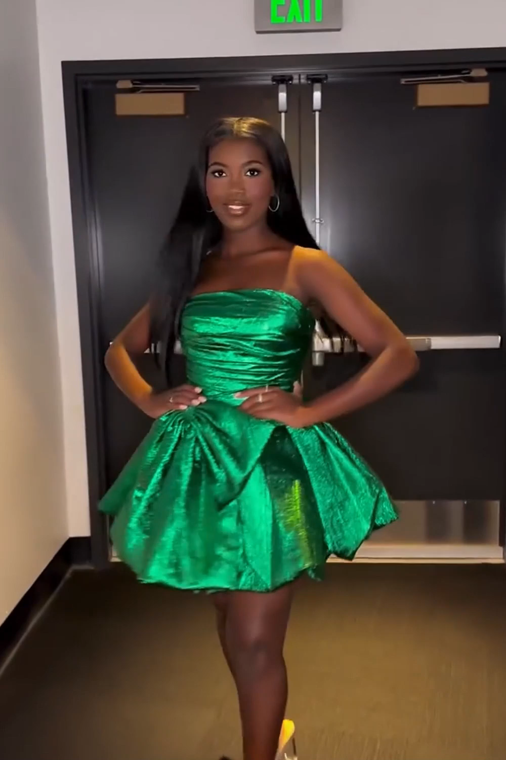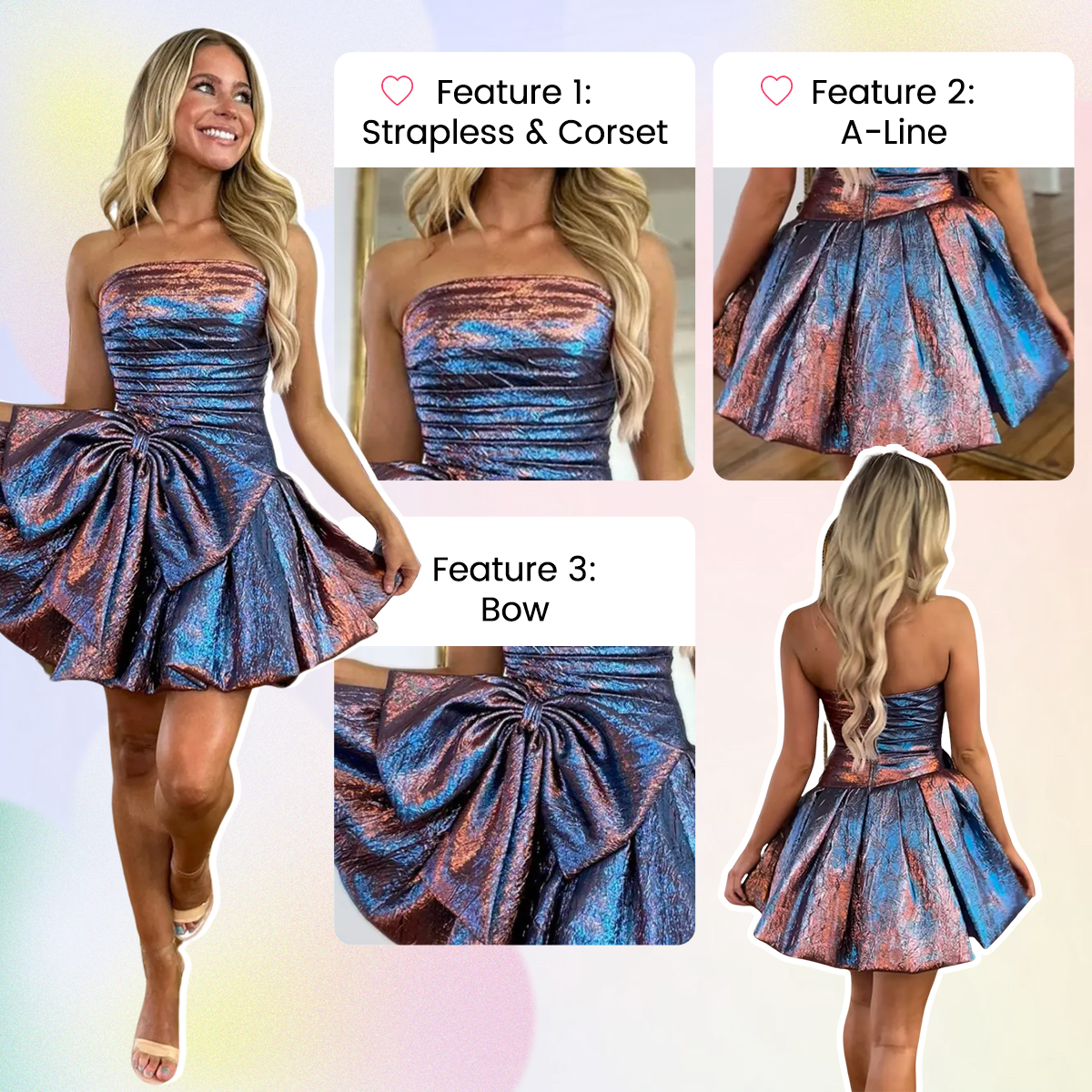 Feature: Turn heads in this stunning Strapless Corset A Line Short Homecoming Dress With Bow. Made from soft fabric, it features a line bodice with details, a strapless design, ruching, and a built-in bra for a flawless fit. The daring bowknot split add modern elegance, making it perfect for prom or special events. Get ready to shine and receive endless compliments!