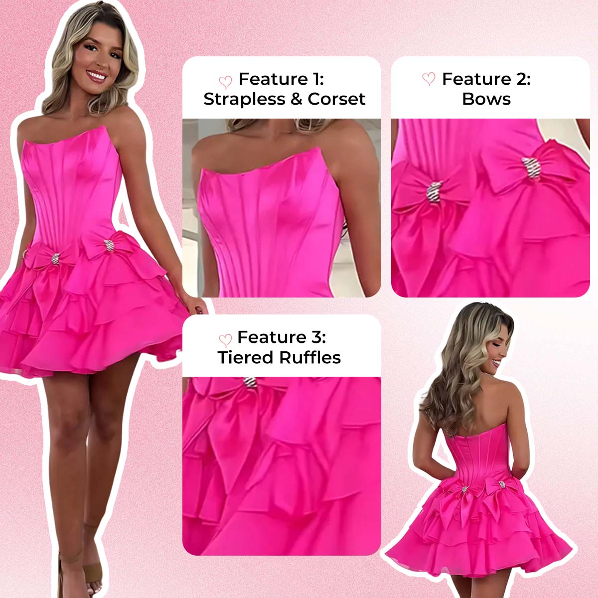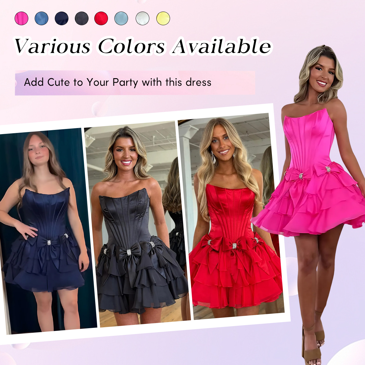 Feature: Step into a dreamy, fairy-tale moment with this elegant strapless A-line mini dress, expertly crafted from luxurious satin and delicate tulle for a luminous sheen and airy texture. Designed to radiate playful charm and bold femininity, it features a structured corset bodice that sculpts your waist, a flattering strapless neckline, and a voluminous ruffled skirt adorned with charming oversized bows and delicate details. The playful drop waist flows into a twirl-ready silhouette, while the soft, breathable lining and zipper-up back ensure all-day comfort and a perfect fit. Whether it’s homecoming, a birthday soiree, a glamorous gala, or a romantic wedding celebration, this dress blends whimsical elegance with confident style—making you sparkle with every movement and ensuring all eyes are on you as you create unforgettable memories.