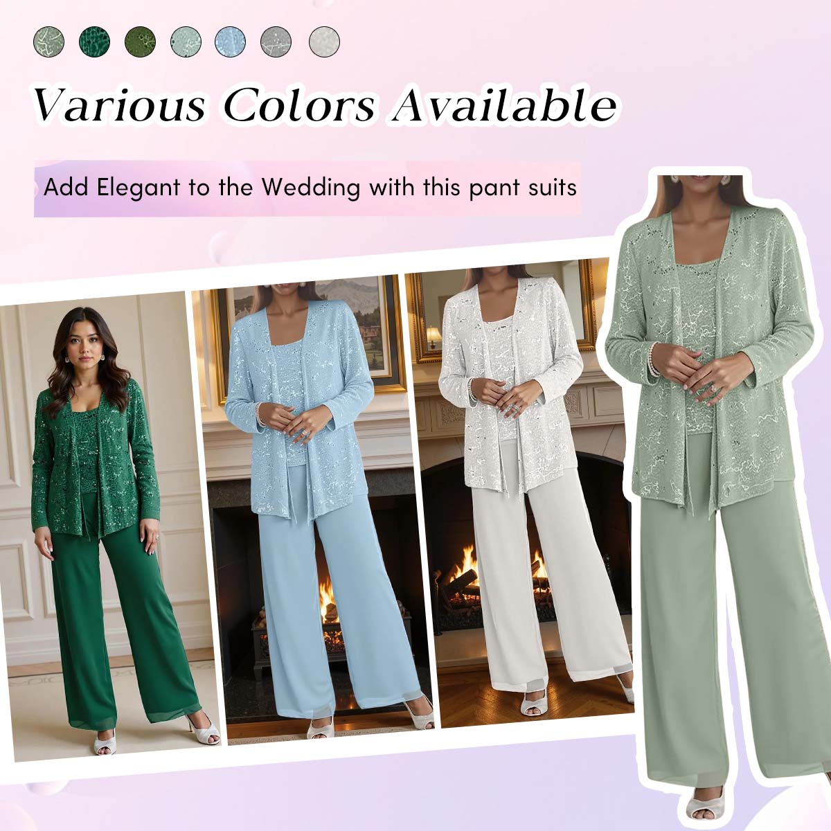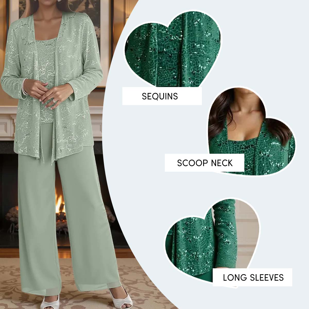 This sparkling chiffon pantsuit combines a shimmering sequin blouse, elegant long-sleeved jacket, and tailored trousers for a look that is both glamorous and modern. Perfect for mothers who wish to shine with contemporary elegance, offering a chic and festive alternative to traditional gowns at formal celebrations.