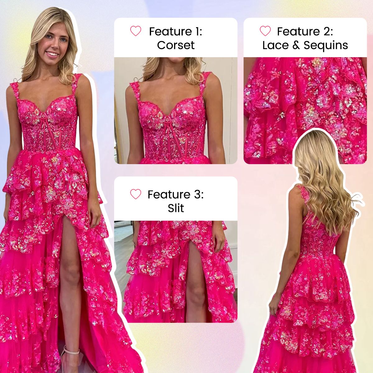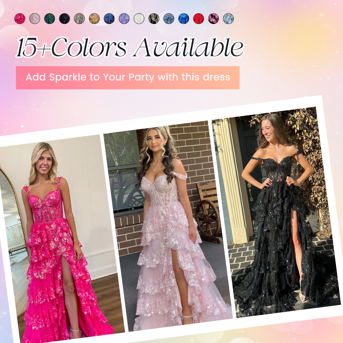 - Embellishment: Slit, Tiered Ruffle, Sequins