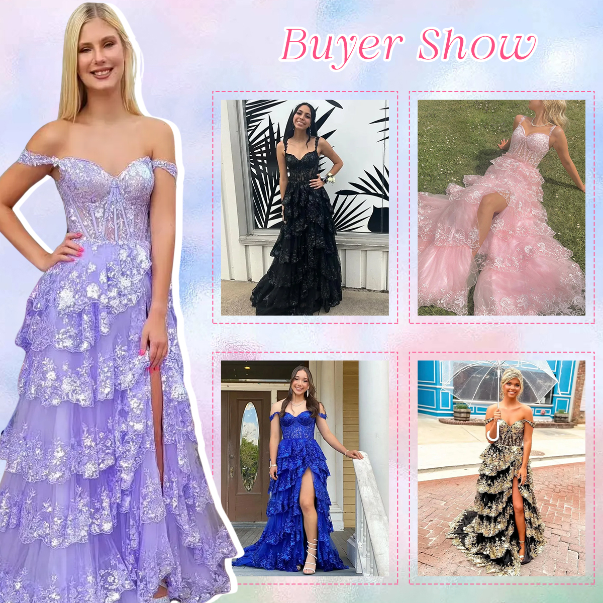 Elevate your style to royal level with our sparkly fuchsia tiered long lace prom dress with slit. The delicate ruffles and intricate lace detailing create a tiered effect, adding dimension and texture to this off the shoulder design. Make a statement at your next formal event with this luxurious and elegant dress.