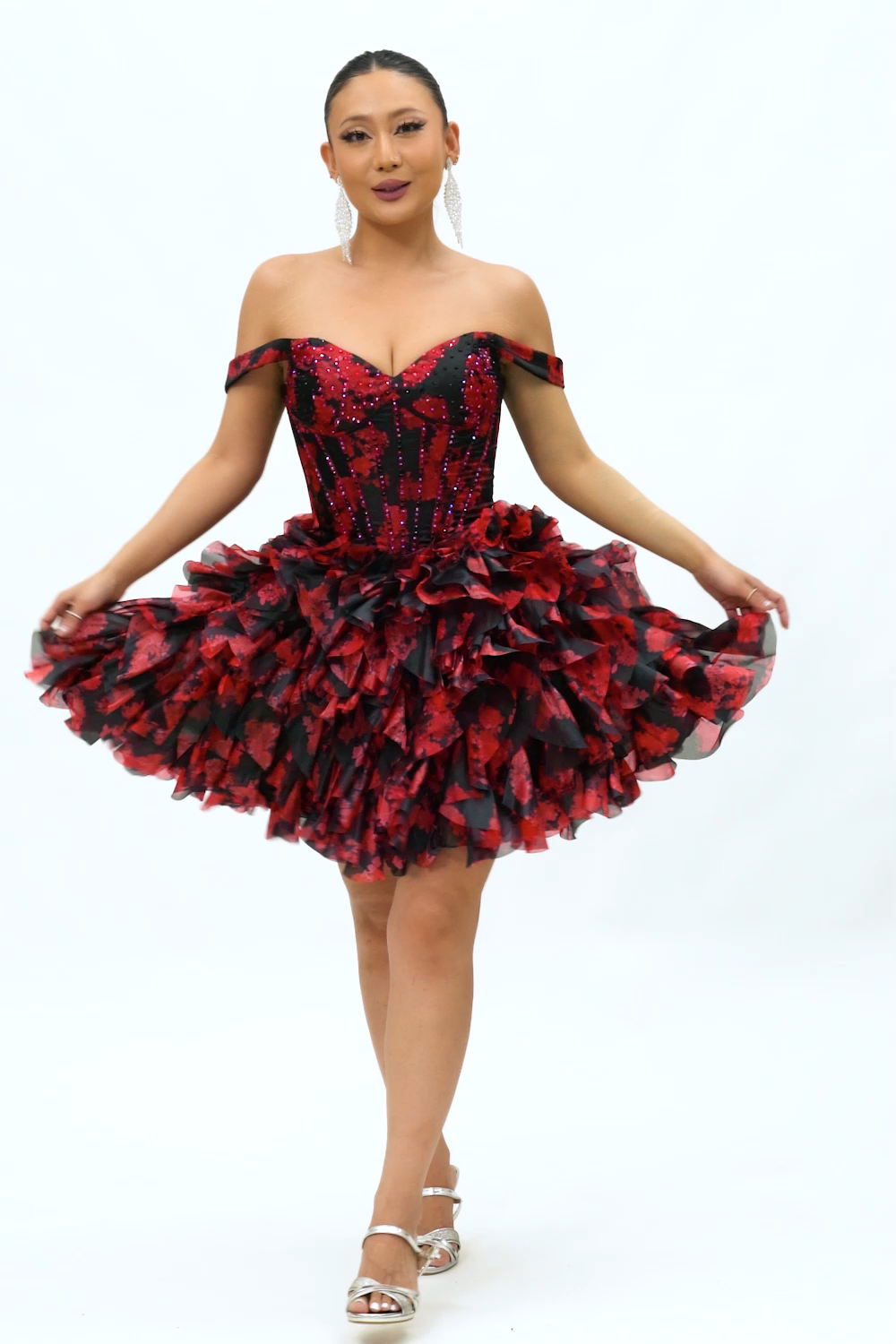 Sparkly Ruffled Black and Red Floral Short Corset Homecoming Dress with Beading