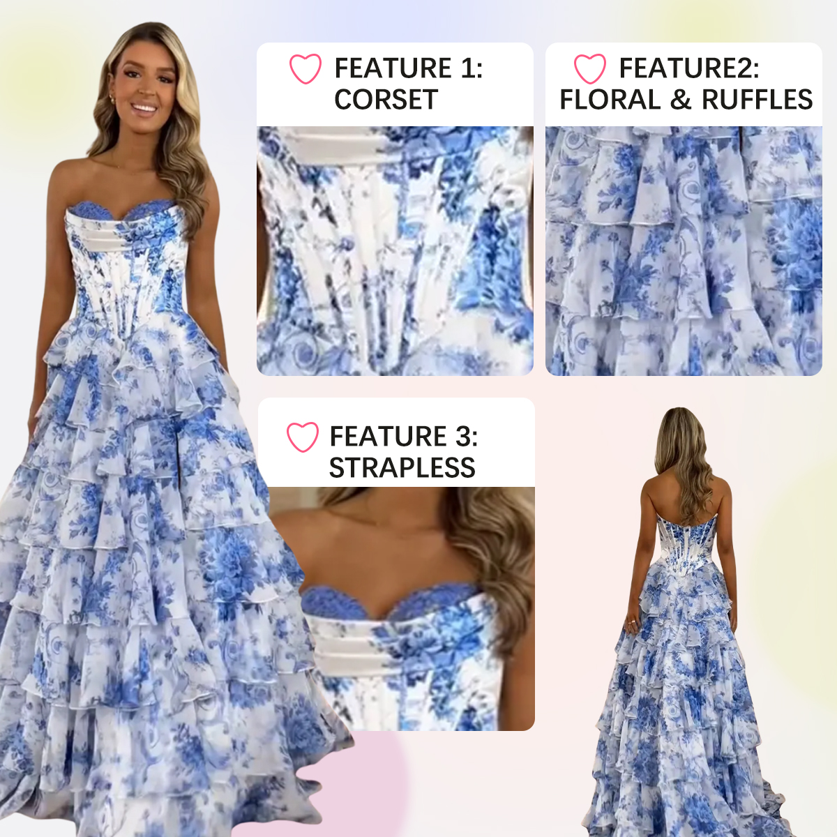Occasion: This White Blue Flower Tiered Sweetheart Corset Long Prom Dress is perfect as a Formal Party Dress, Prom Dress, Evening Dress or Bridesmaid Dress. It is also suitable for Dinners, Pageants, Holidays, Receptions, Engagements, Ceremonies, Quinceañeras, Debutante Balls, Anniversaries, Thanksgiving Day, Special Events and Birthday Parties. Additionally, it works well for Casual Wear, Beach Outings, and various other formal occasions.